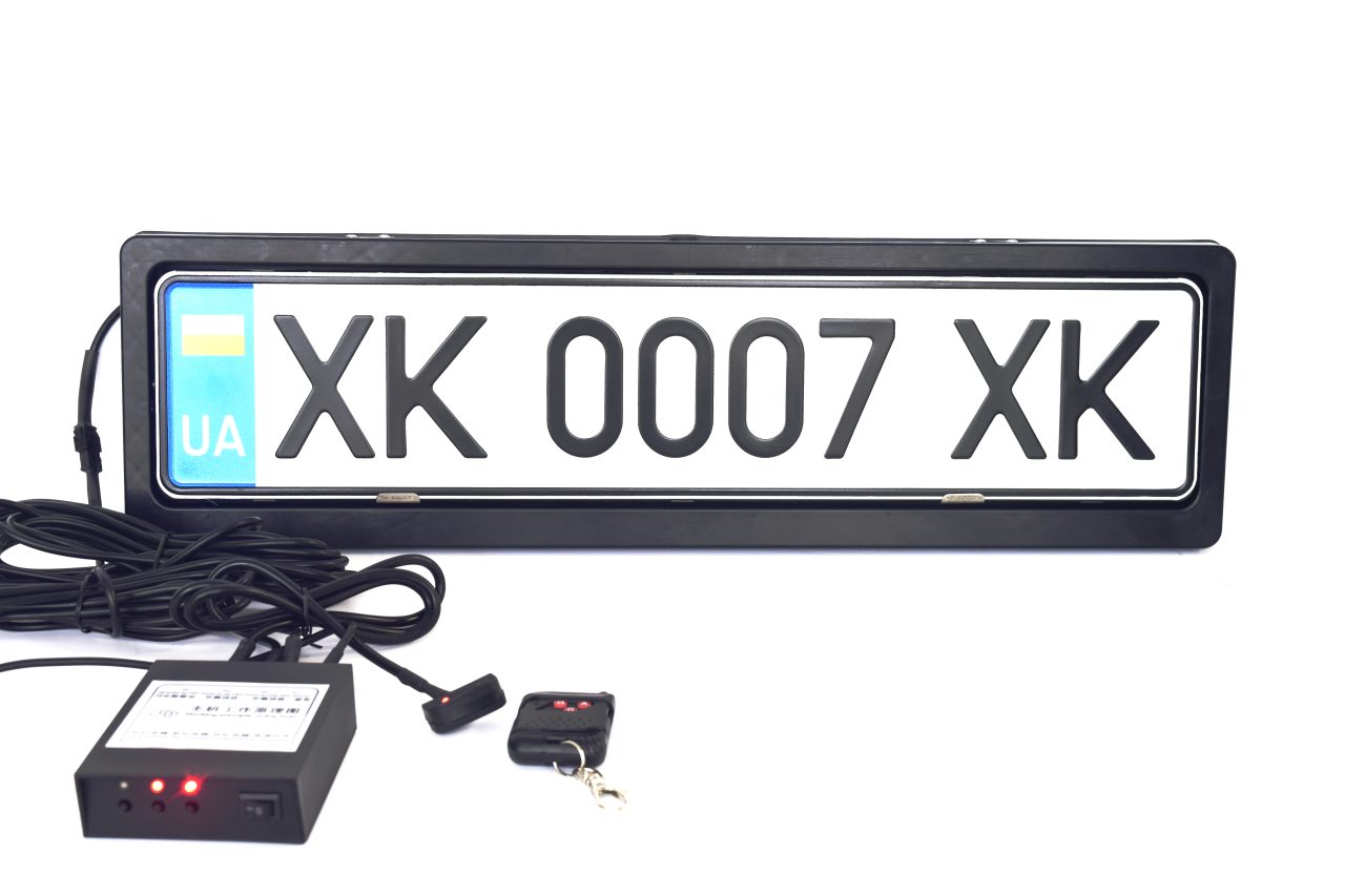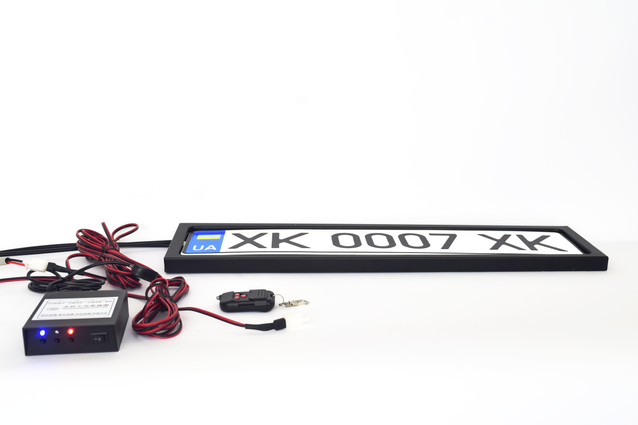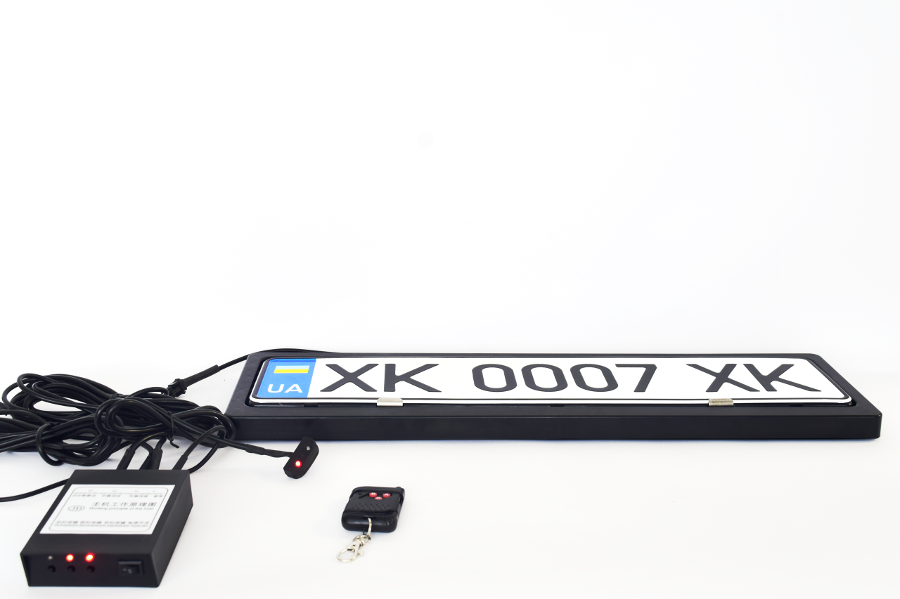An automatic frame is an electromechanical device that instantly flips or changes the license plate. It can be made from metal or plastic and comes in different sizes — standard European (520×112 mm) or American format (305×155 mm) for cars with non-standard mounting.