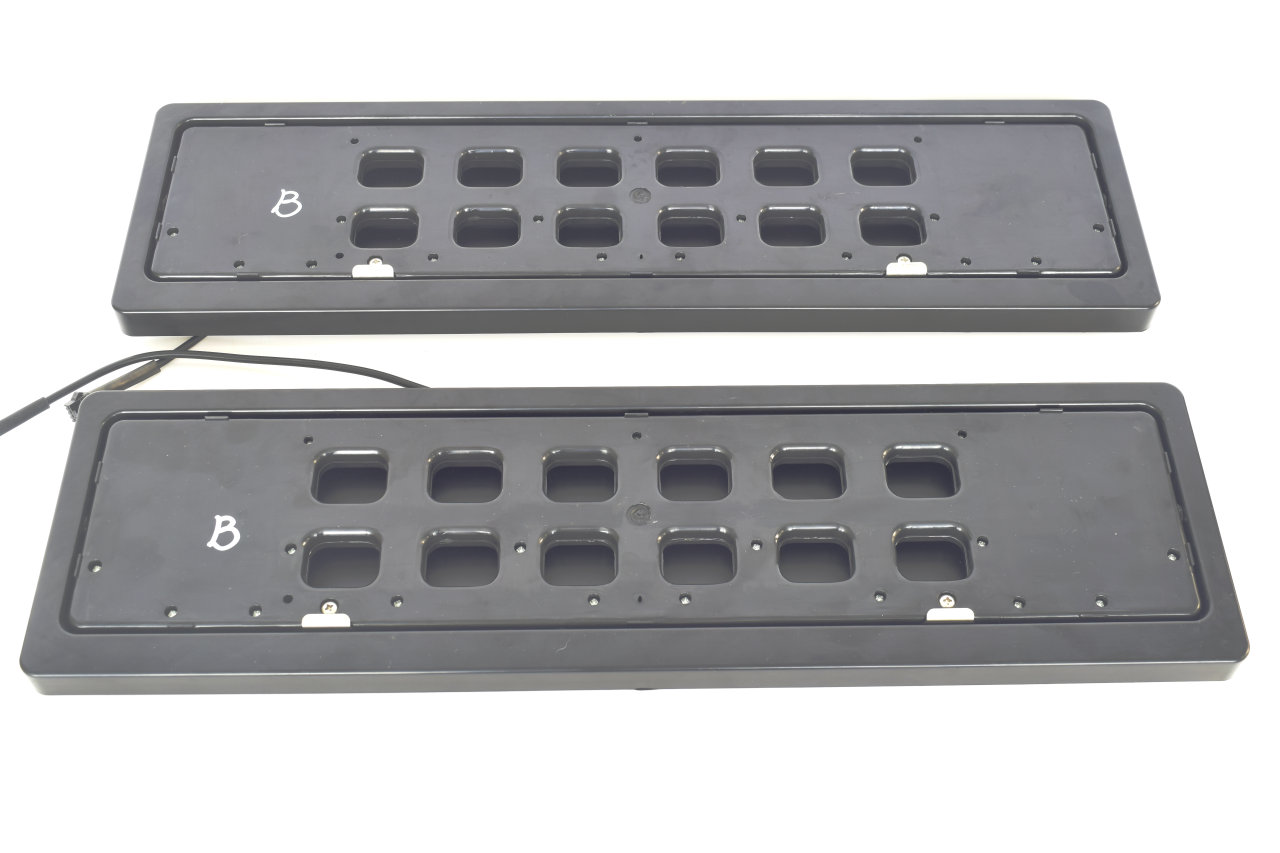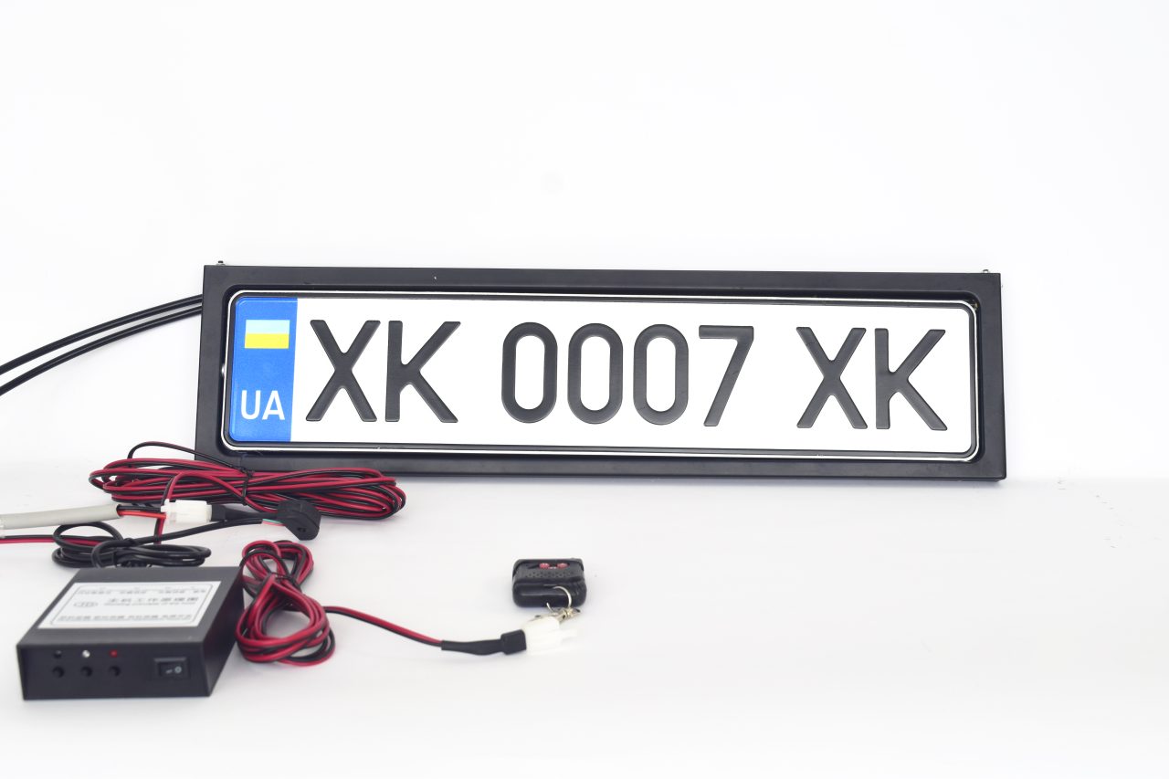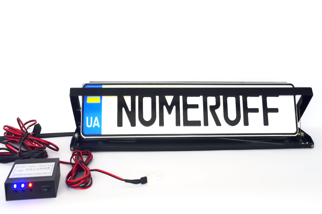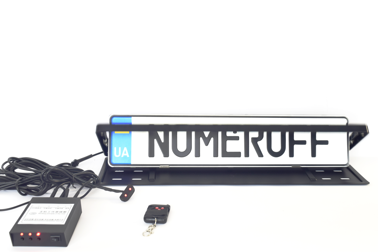 An automatic frame is an electromechanical device that instantly flips or changes the license plate. It can be made from metal or plastic and comes in different sizes — standard European (520×112 mm) or American format (305×155 mm) for cars with non-standard mounting.