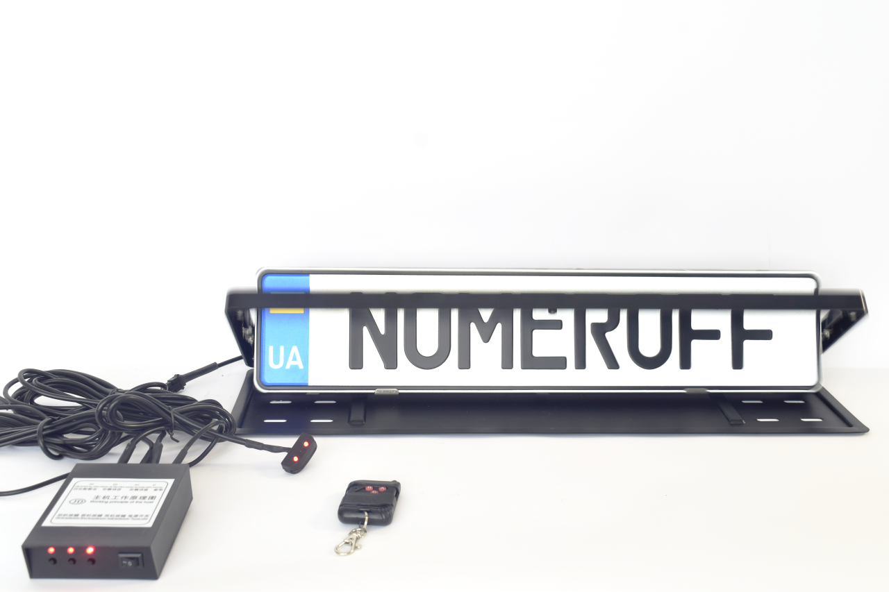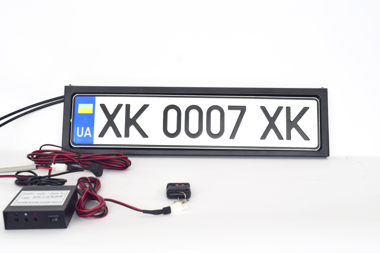 An automatic frame is an electromechanical device that instantly flips or changes the license plate. It can be made from metal or plastic and comes in different sizes — standard European (520×112 mm) or American format (305×155 mm) for cars with non-standard mounting.